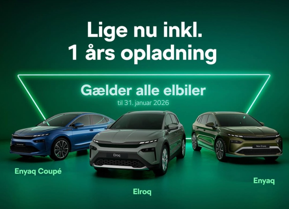 * Clever-kampagne gælder 15.12.25 til 31.01.26. Forudsætter bestilling af Clever One til Elroq eller Enyaq hos autoriseret Škoda-forhandler. 1 års Clever One + evt. energitillæg med standardinstallation til samlet værdi (privatkøb): 12.087 kr. Mindstepris i bindingsperiode (6 mdr.): 0 kr. Kan opsiges med løbende måned + en måneds varsel efter bindingsperioden. Fortrydelsesret på abonnementet gælder. Tilbagebetaling: Udregnes som dit kWh-forbrug x gns. strømpris pr. kWh i DK kl. 24-06 i måneden. Læs mere: clever.dk/tilbagebetaling. Gælder Enyaq og Elroq. Halvårlig CO2-ejerafgift: 460 kr. Forbrug*: 14,8-16,5 kWh/100 km. Rækkevidde*: 375-585 km. *Forbrug og rækkevidde påvirkes bl.a. af kørestil, vejrforhold og ekstraudstyr. Forv. lev. inden for 6 mdr. Se mere på skoda.dk.